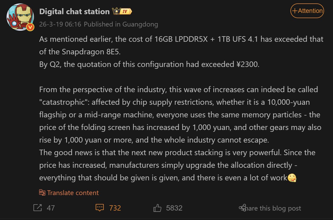 La raíz de estas turbulencias del mercado se encuentra en las graves restricciones de suministro de chips. Los datos del sector revelan que el coste de la lista de materiales (BOM) de una combinación premium de 16 GB LPDDR5X + 1 TB de almacenamiento UFS 4.1 alcanzó la asombrosa cifra de 318 $ (2.300 CNY) en el segundo trimestre de este año.