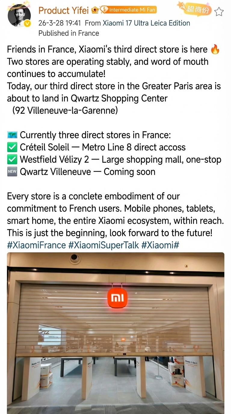 En una reciente actualización, Xiaomi Francia aclaró que la anterior presencia de la marca en los emblemáticos Campos Elíseos estaba gestionada por un socio externo y se cerró durante la pandemia. La nueva era del comercio minorista de Xiaomi en Francia se centra en las Operaciones Directas, garantizando que cada interacción con el cliente -desde la compra de un buque insignia con Snapdragon 8 Elite hasta la recepción de asistencia técnica- cumpla los estándares globales de Xiaomi.