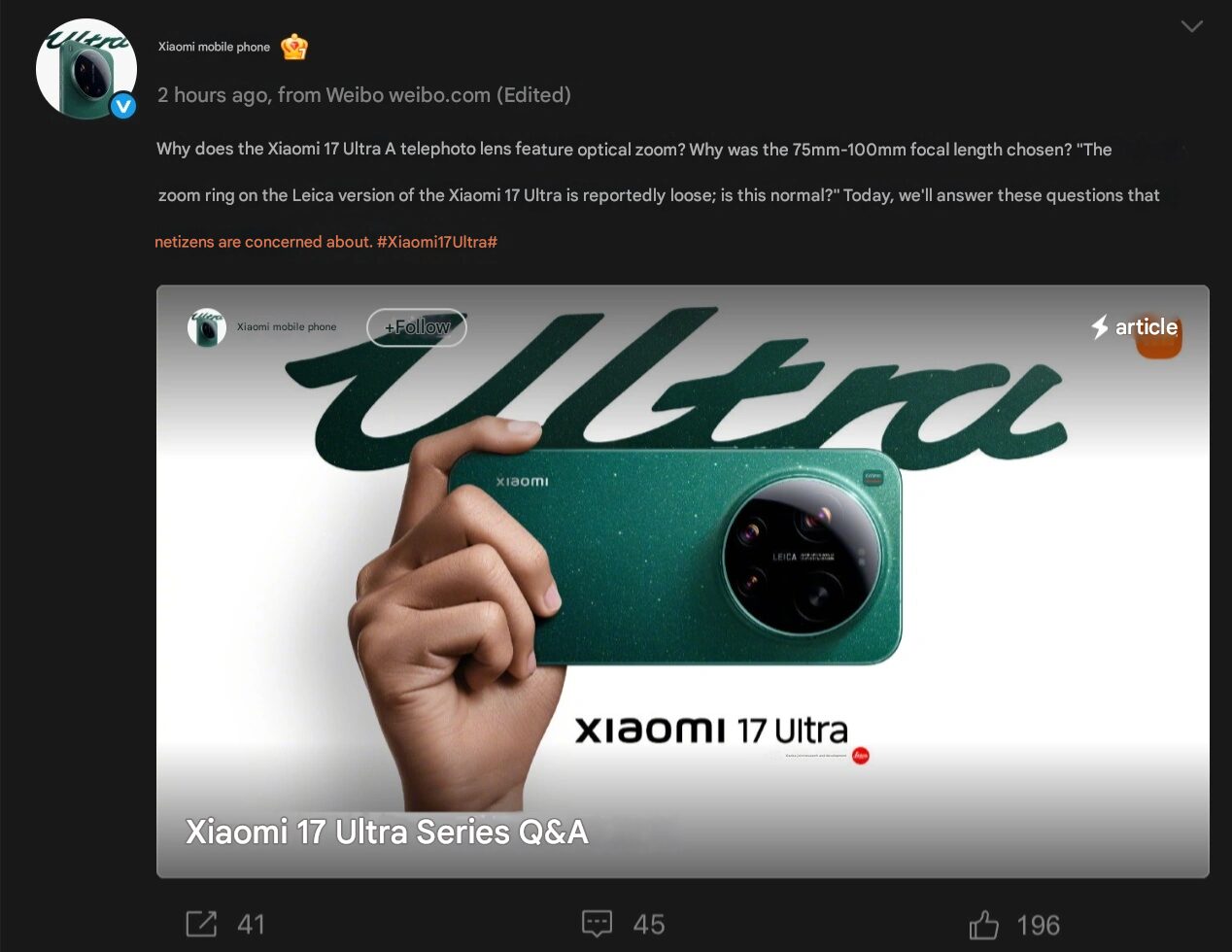 Explanation by Xiaomi for loose Xiaomi 17 Ultra Leica Edition zoom rings