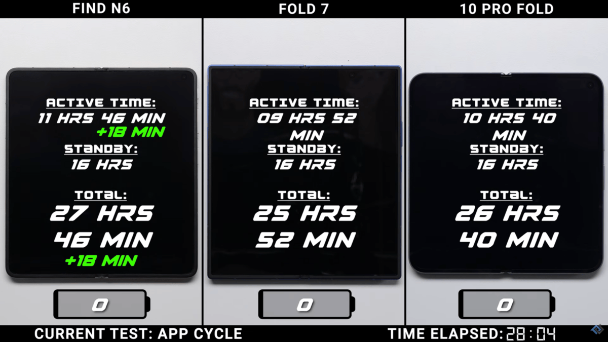 The test simulated everyday smartphone use, including social media scrolling, web browsing, video playback, and gaming. After nearly 28 hours of continuous use, the Find N6 emerged on top, lasting an impressive 27 hours and 46 minutes before shutting down.