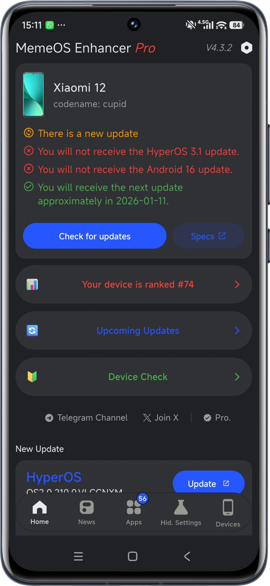 Xiaomi fans can now easily check if their devices are eligible for the HyperOS 3.1 update through the MemeOS Enhancer app. Through downloading the app from the Google Play Store and running it, users can see an option on the homepage showing whether their device is to receive HyperOS 3.1 or not. You can also follow the latest update rollout news through our partner site HyperOSUpdates.com.