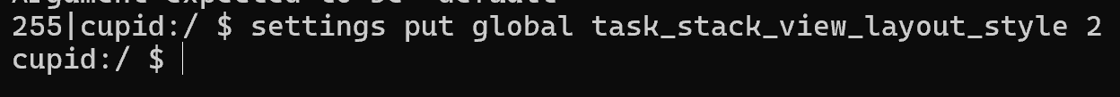 Once the command has been executed, the interface for viewing recently used applications transitions into the “card” layout. It is not necessary to reboot the device, though a reboot may help ensure that animations are stable on some devices.