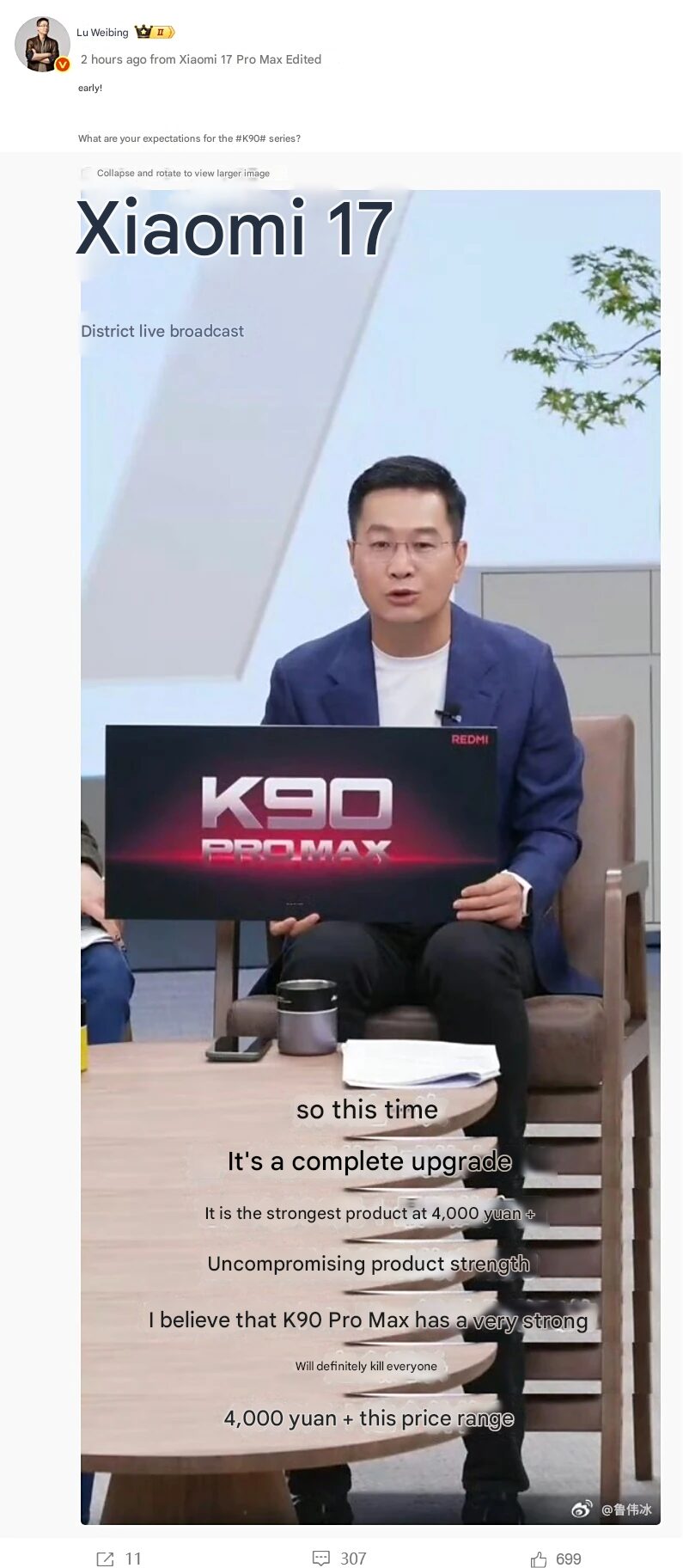 Weibing’s latest Weibo post underscores the company’s confidence in the K90 Pro Max, describing it as their strongest device to date. He emphasized that this model is positioned to lead the 4,000 yuan+ price range, combining robust hardware with Xiaomi’s integrated system strengths. Clearly, Xiaomi is intent on reinforcing its position in the upper mid-range segment by delivering strong value and high performance.
