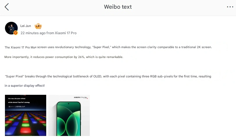 “Unparalleled screen clarity and power savings” were also touted by Lei Jun, CEO of Xiaomi, when talking about another breakthrough achieved in the Xiaomi 17 Pro Max, which applies Super Pixel display technology.