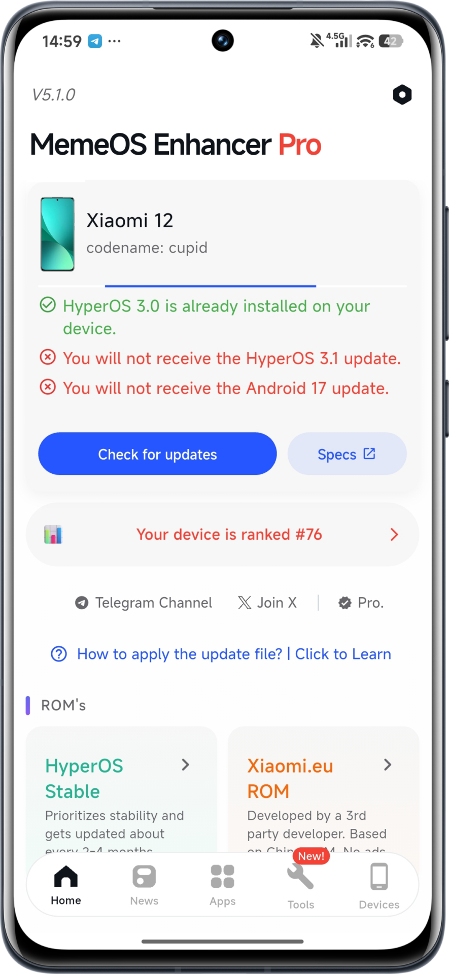 MemeOS Enhancer has updated for checking Android 17 eligibility. When you open the app, your device will be automatically detected and it will tell you whether you can receive the Android 17 update.