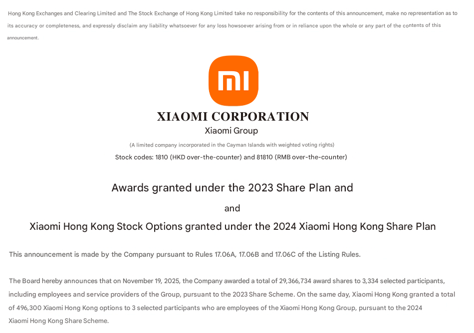 Xiaomi awards HK$1.14 billion in shares amid strong Q3 growth