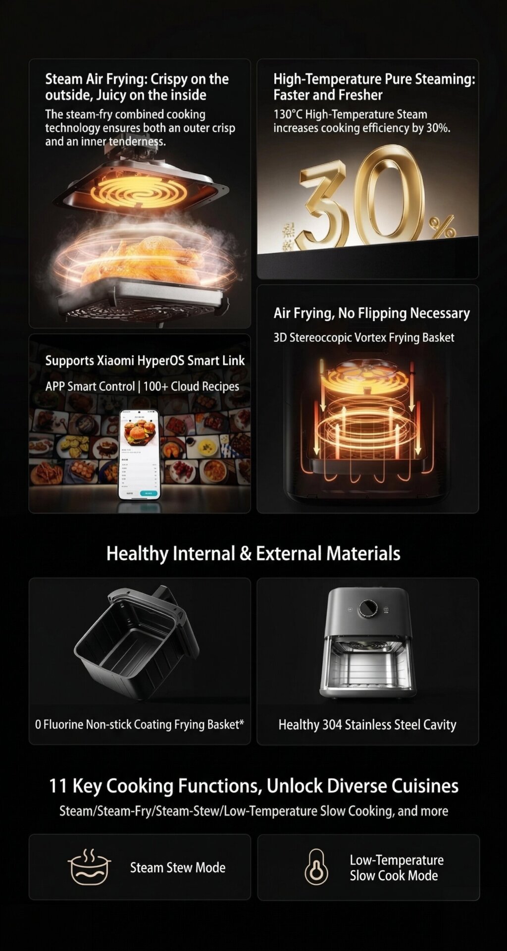 Medium-to-High Temperature: Traditional air frying, baking, and professional steaming.