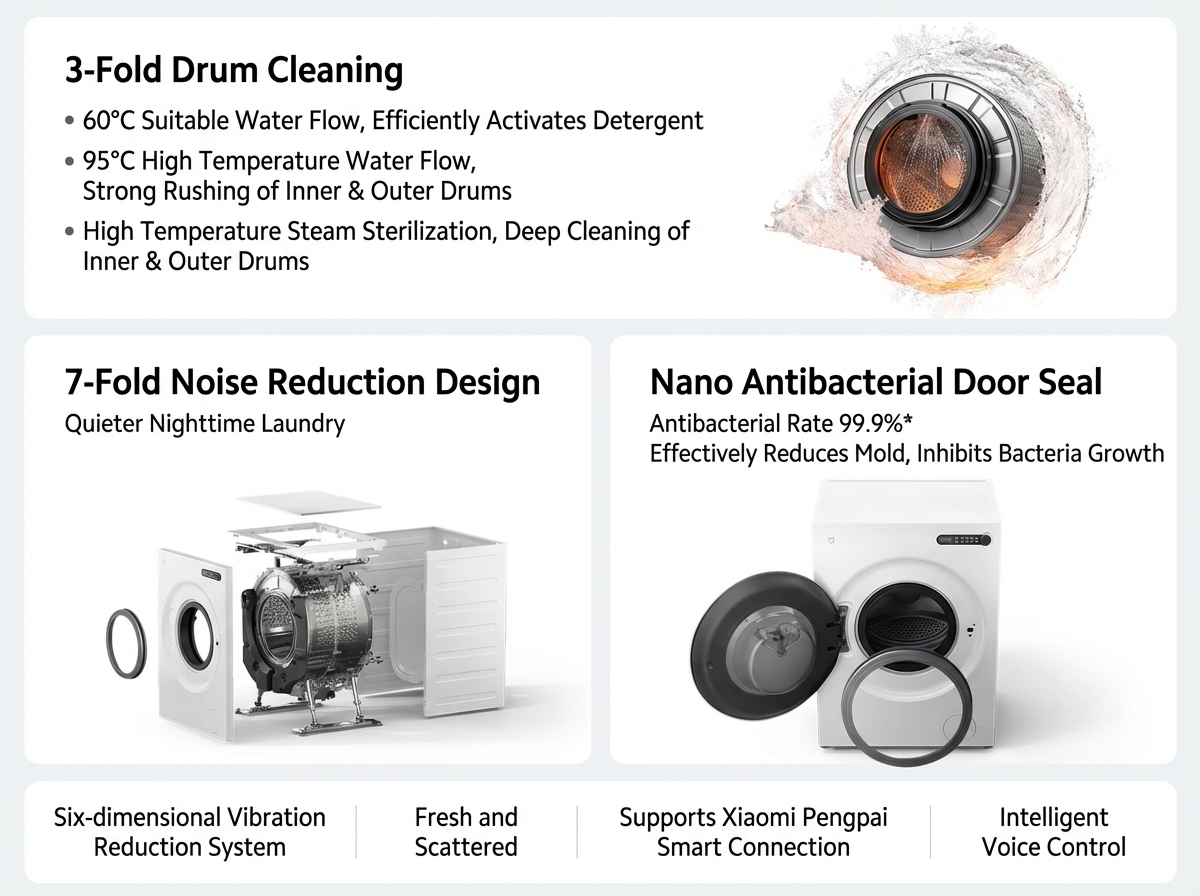 Hygiene & Maintenance: Equipped with a 3-layer drum cleaning system that utilizes 60°C warm water, 95°C high-temperature water, and steam sterilization. It is further protected by a 99.9% nano anti-bacterial door seal.