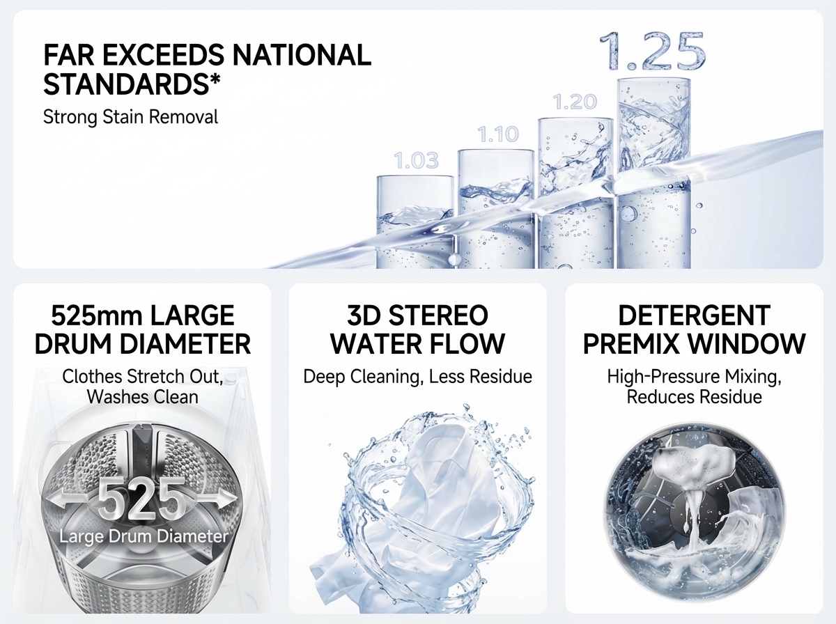 Drum Mechanics: Utilizes a 525mm large cylinder diameter combined with 3D three-dimensional water flow and a detergent pre-mixing window for deep stain removal with minimal residue.