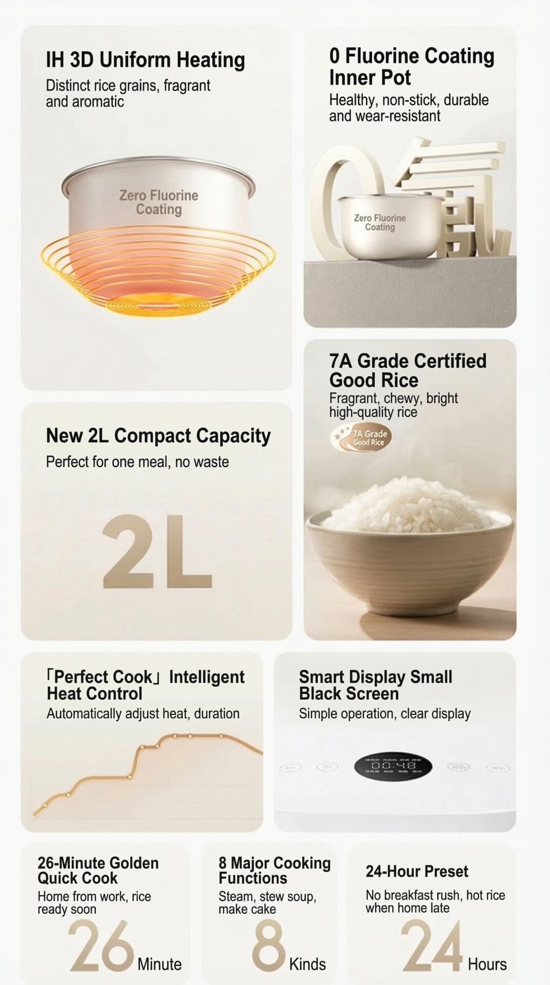 • Versatile Cooking Modes: The cooker supports eight dedicated functions, including Fine Cooking, Quick Cooking, Porridge, Nutritious Steaming, Soup, and even Cake making.