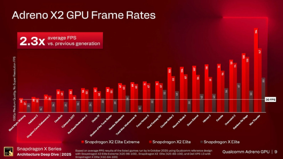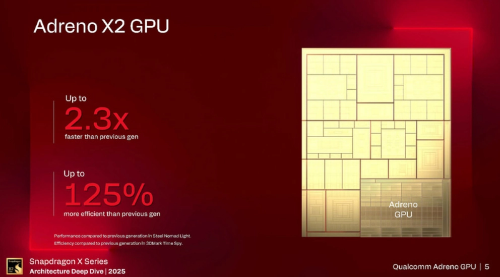 According to Qualcomm, the Adreno X2 GPU in the Snapdragon X2 Elite provides 2.3× higher graphics performance compared to the previous generation. This architecture is designed to support demanding workloads and offers a significant upgrade from earlier models integrated into mobile chipsets, such as the Snapdragon 8 Elite.