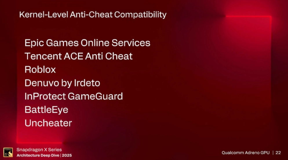 A significant portion of this improvement is contributed by the support for natively Arm-based anti-cheat technologies. Such solutions now include Epic Games Online Services (EAC), Tencent ACE Anti-Cheat, Denuvo, GameGuard, and others with an Arm equivalent, allowing stable execution of major titles such as Fortnite.