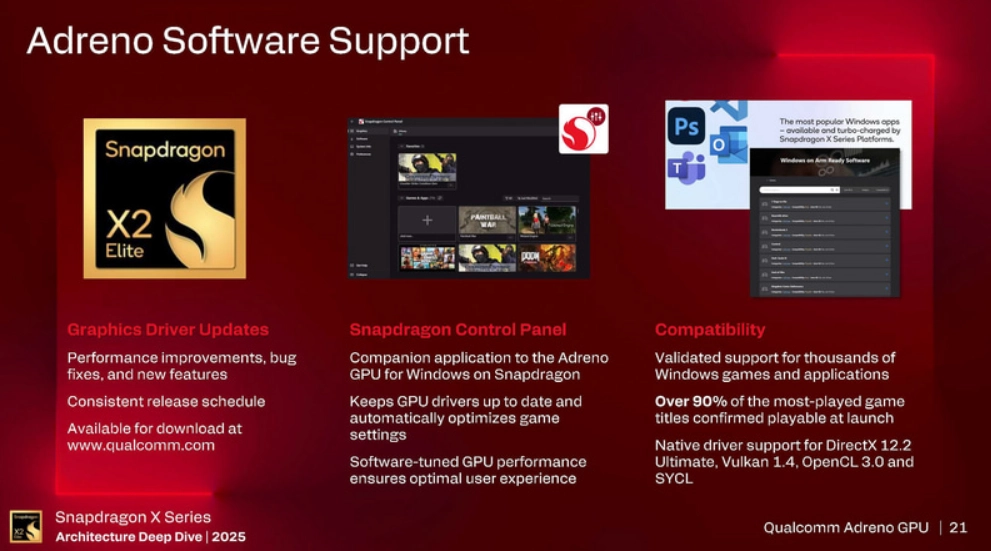 Qualcomm is mending long-standing compatibility issues for Windows games on Arm devices: Compatibility, through better driver distribution and game studio collaboration, is at about 90%, up from 70% last year. Qualcomm intends to release the GPU drivers quarterly, in March, June, and September, with the ultimate goal of matching the fast cadence both AMD and Nvidia currently use.