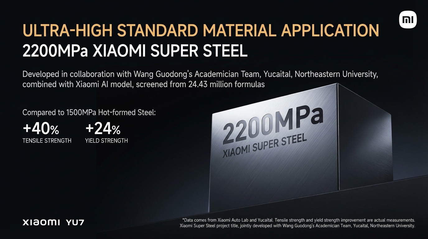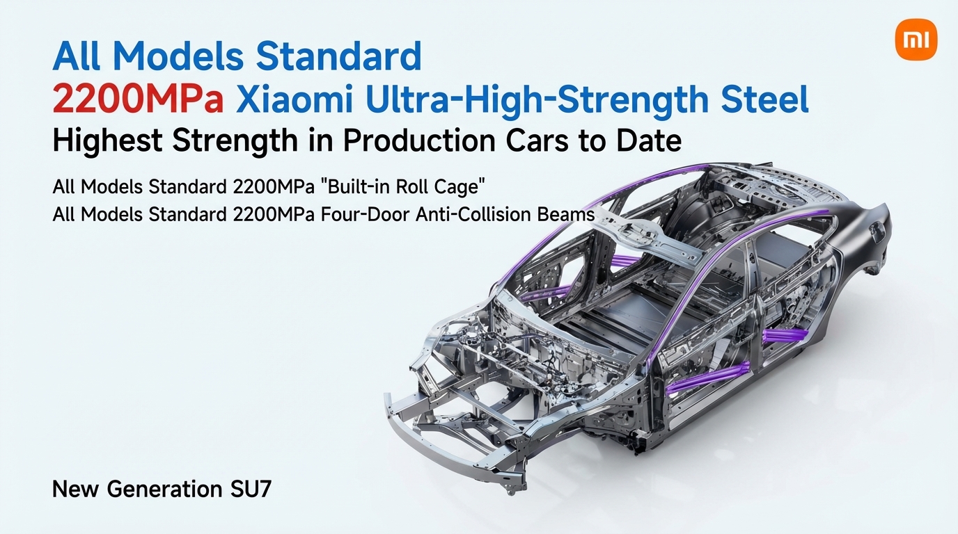 The 2200MPa steel effectively creates an “embedded roll cage,” drastically improving vehicle integrity during side collisions and rollovers. By utilizing higher-strength materials, Xiaomi enhances safety without adding excessive weight, preserving the battery efficiency and performance of their EVs.