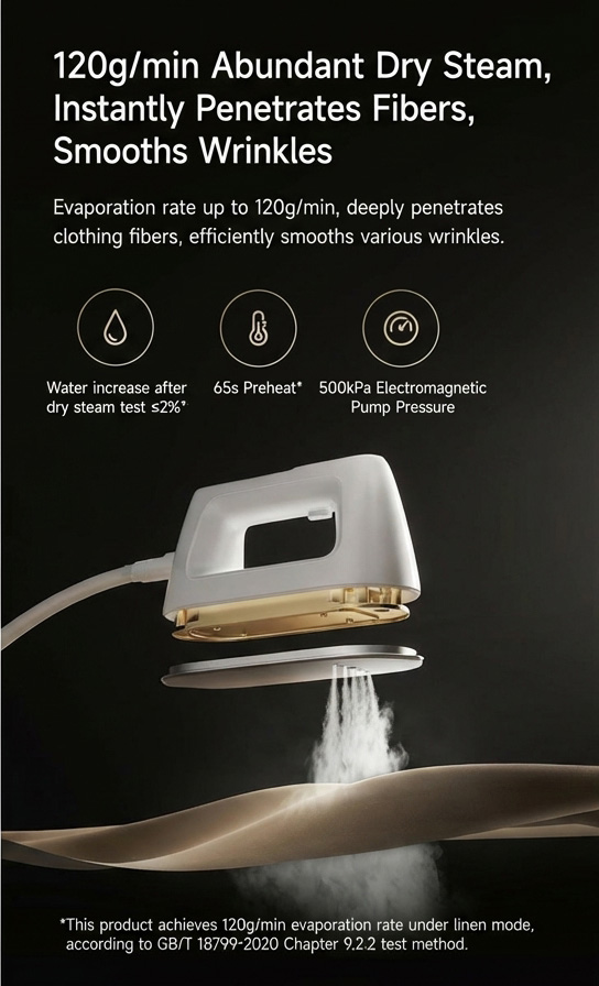 Massive Steam Volume: It delivers a steady 120g/min evaporation rate, ensuring even heavy fabrics like wool and linen are smoothed quickly.