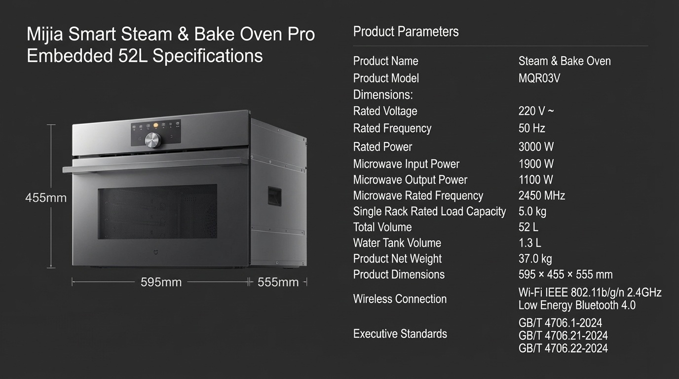 The new 52L Pro Embedded oven (Model MQR03V) continues Xiaomi’s sleek, modern design language. The front panel is equipped with a crisp TFT color screen and features a magnetic detachable knob on the bottom for seamless, tactile interaction.