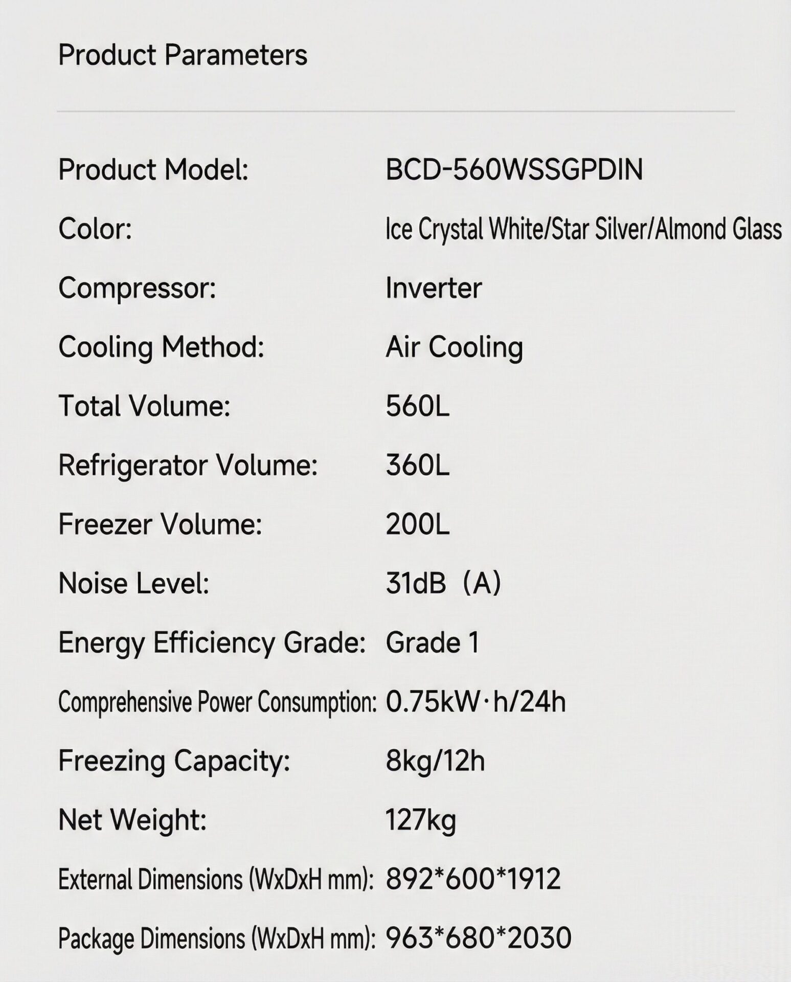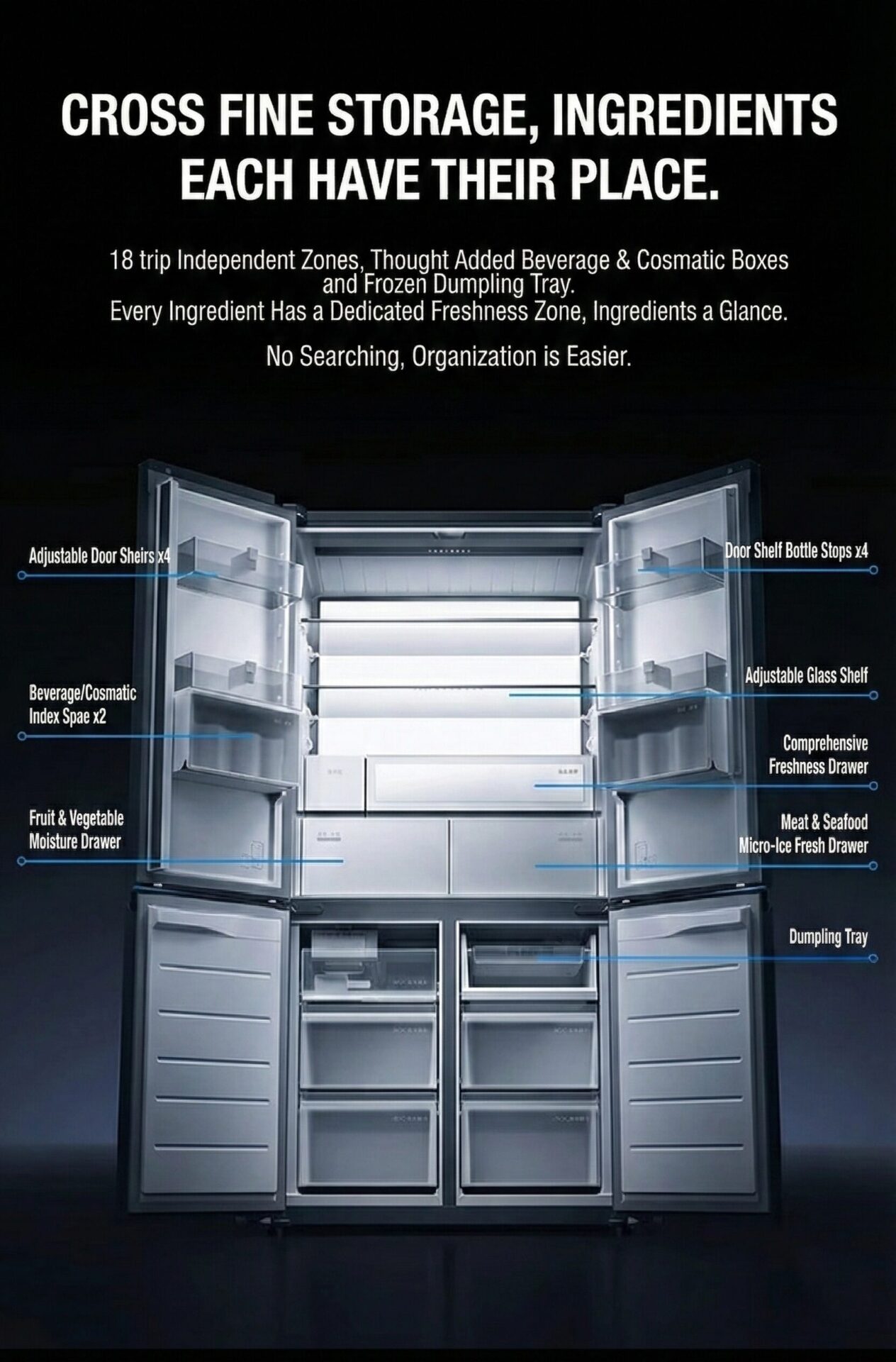 Unlike regular vertical refrigerators, this model uses a cross-type internal layout for better space organization and accessibility. The 560-liter capacity is designed for big households and built-in kitchen architectures.