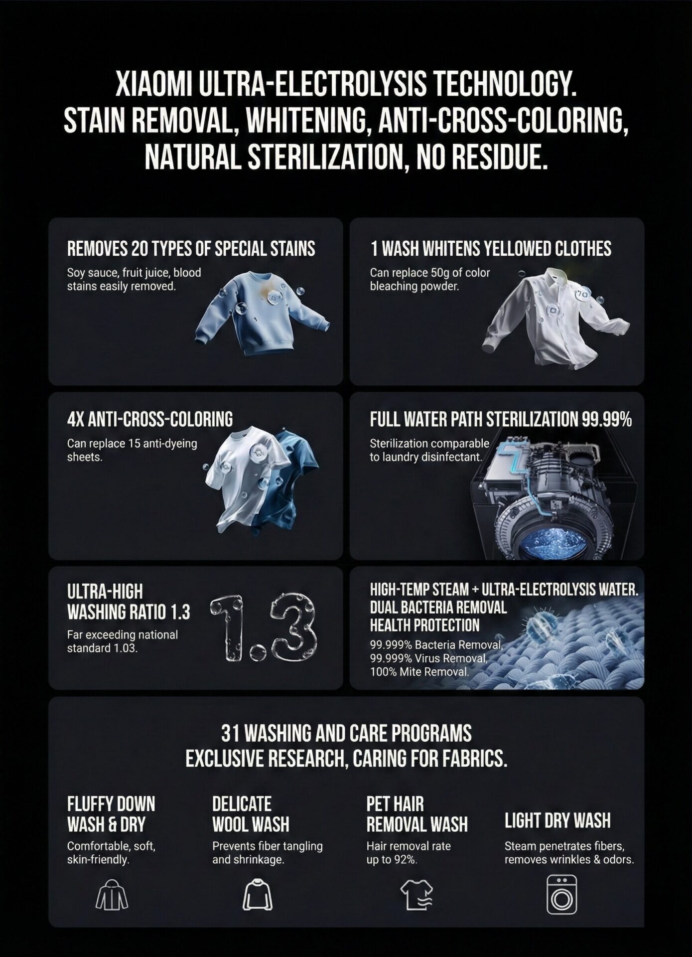 • Key Tech: Equipped with “Super Electrolysis”, which removes 20 types of stains and whitens clothes.